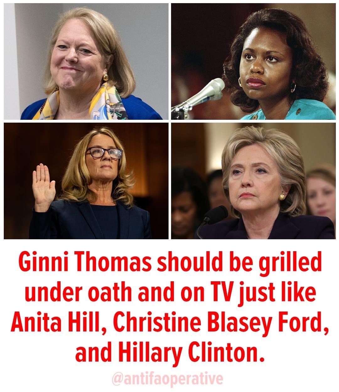 The meme resonates in light of ongoing discussions about the treatment of women in public discourse, especially regarding allegations of misconduct. Anita Hill’s testimony in 1991 and Christine Blasey Ford’s during the Brett Kavanaugh hearings are pivotal moments that exposed the systemic challenges women face when speaking out against powerful figures. By calling for Ginni Thomas to undergo similar scrutiny, the meme underscores a demand for fairness and equality in how all individuals, regardless of their political affiliations, are treated under the law.